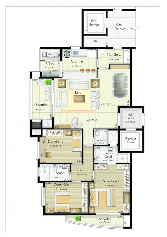 Apartamento no 14 º andar, com 01 suite + 02 quartos, com 03 vagas de garagem e sem móveis.